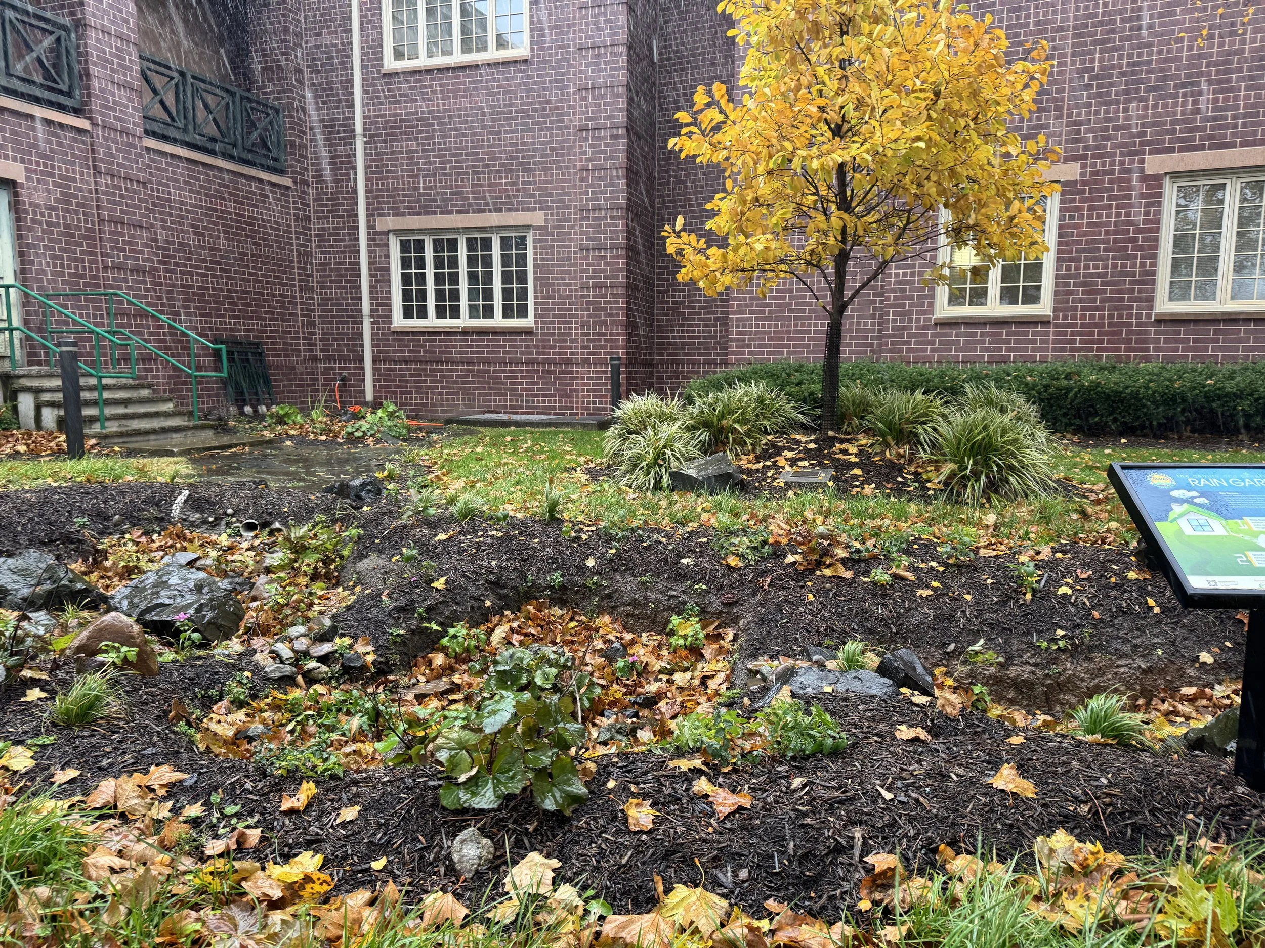 The point is, without a base knowledge of these plants, there’s not guarantee the people management of the rain garden will be successful. In the case of Summit, they felt it made sense for us to not only design and install the rain garden. They wanted us to maintain it too. I think that’s the best way to address all of the concerns of keeping the garden alive. The image below here was taken during a larger rainstorm at the beginning of November. The autumn leaves have found their way into it. The rainwater is still easily managed, and the plants are all very healthy.