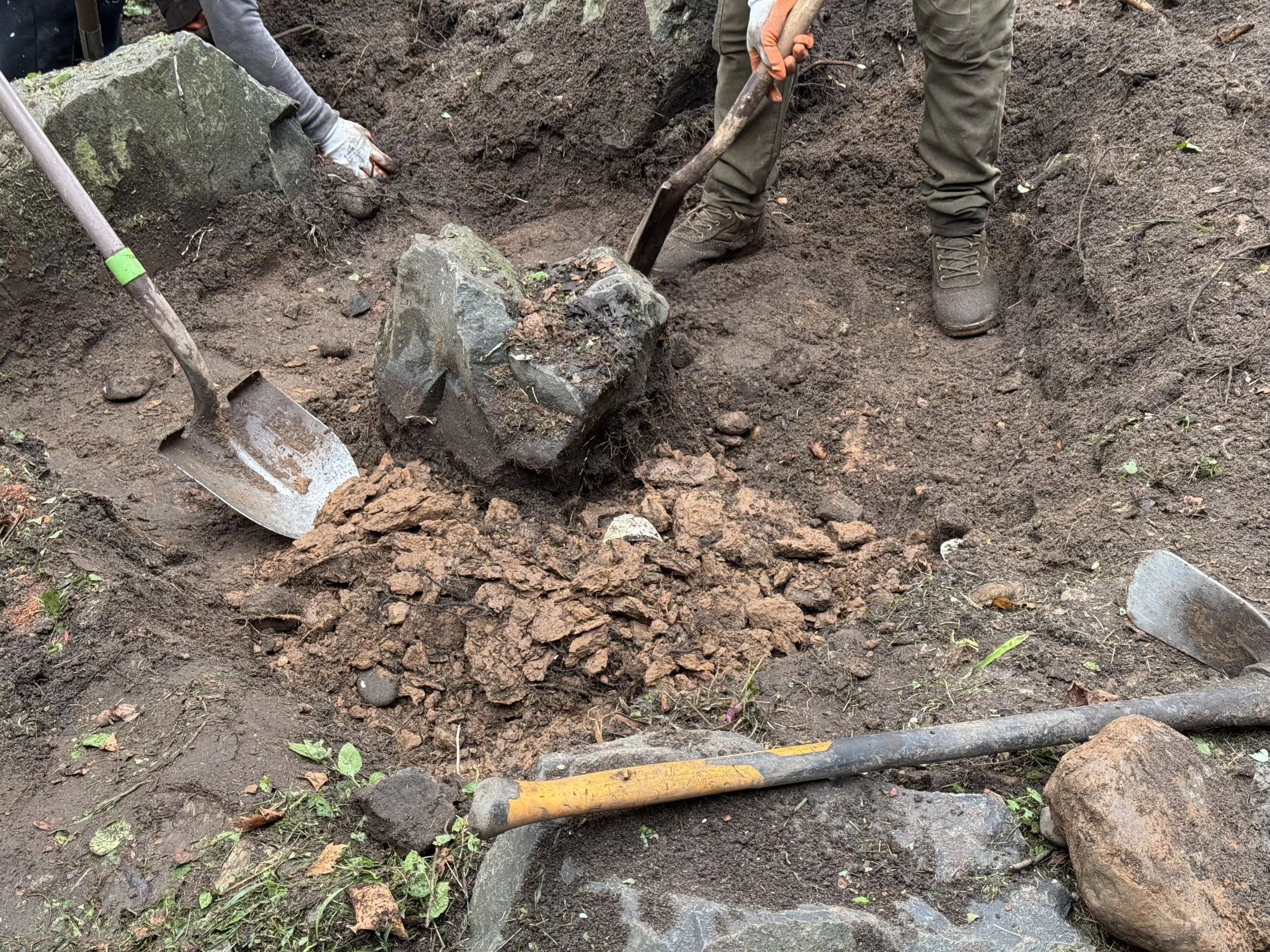 As you can see in the image above, we cleared the area before we started to excavate. We typically don’t use heavy equipment to dig green infrastructure. Large machinery will cause compaction of the soil - and we don’t want that. Compacted soil create several negative impacts - most of all, it limits the rate of infiltration during storms. Even small backhoes and skids can compact the soil. It’s always best to use hand tools during the construction. There were lots of rocks and boulders to address. Plus, in most parts of Union County, any mild amount of digging will unearth dozens of stones in an assortment of sizes. Luckily, we had planned for this and reused all of them for the new garden. The image below shows our pile of rocks during the early stages of the build.