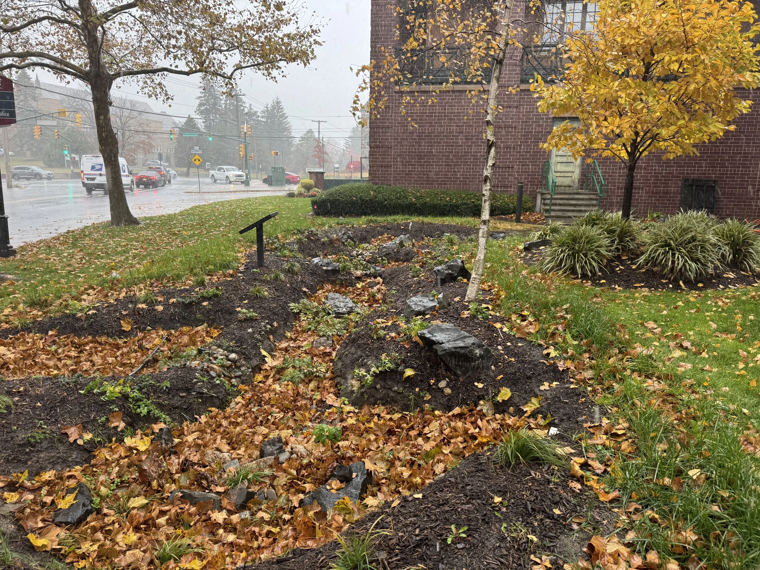 Back in November of 2024, I went by the city hall in Summit, NJ to checkout a rain garden that had been built back in 2016. It was original installed by the Rutgers Cooperative Extension Water Resources Program (RCE) with funding by the Department of the Interior through a grant from the National Fish and Wildlife Foundation’s Hurricane Sandy Coastal Resiliency Competitive Grant Program. From the information on the RCE website, the original design was of a hybrid dry creek/bioswale with a shallow basin to detain stormwater coming off the roof of city hall. In researching the history of the project, I reviewed images of the corner of Morris and Springfield on Google Maps. There, I could see the state of the rain garden from fall of 2016 to summer of 2021. The street views tell a story of blossoming rain garden thriving more and more each season. However, at some point between 2021 and 2024, the garden had taken a turn for the worst. By the time of my visit, the lushness I saw on Google Maps had given way to dead shrubs, invasive knotweed and lots of blank spots where nothing was growing at all.